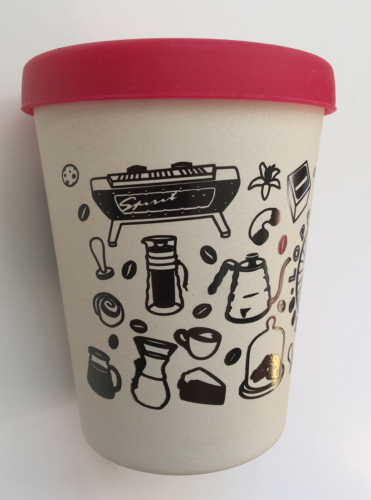 In diesem Motiv finden sich alle wichtigen Kaffee-Utensilien und Leckereien des Loppokaffee wieder: Vom Kaffeefahrrad über die Siebträgermaschine, der Chemex, dem Hario-Filter bis zu den leckeren Mandelhörnchen und dem köstlichen Guiness-Kuchen.