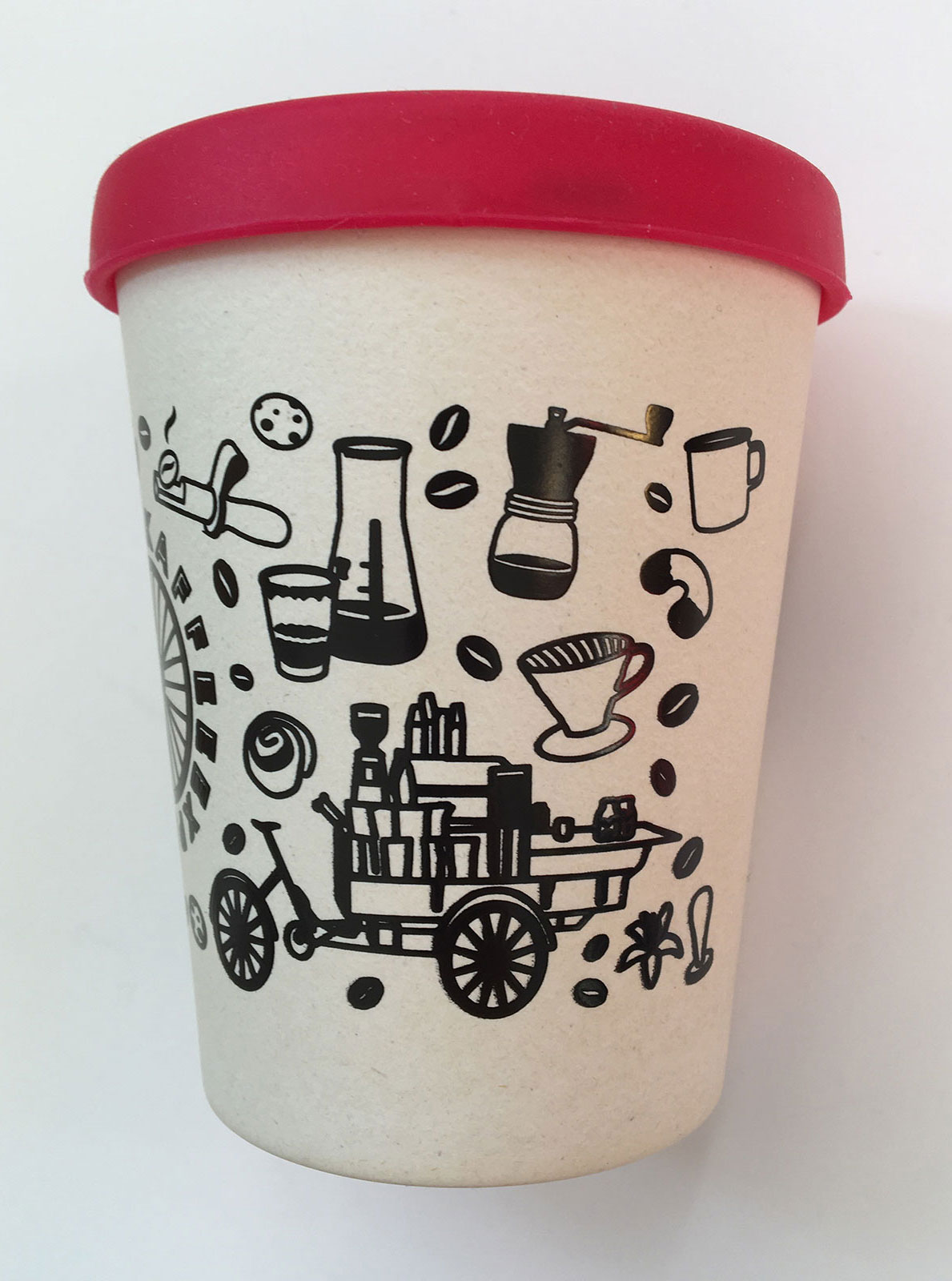 Das Motiv wurde auf T-Shirts, Stoff-Taschen und Bambus-Mehrwegbecher gedruckt.